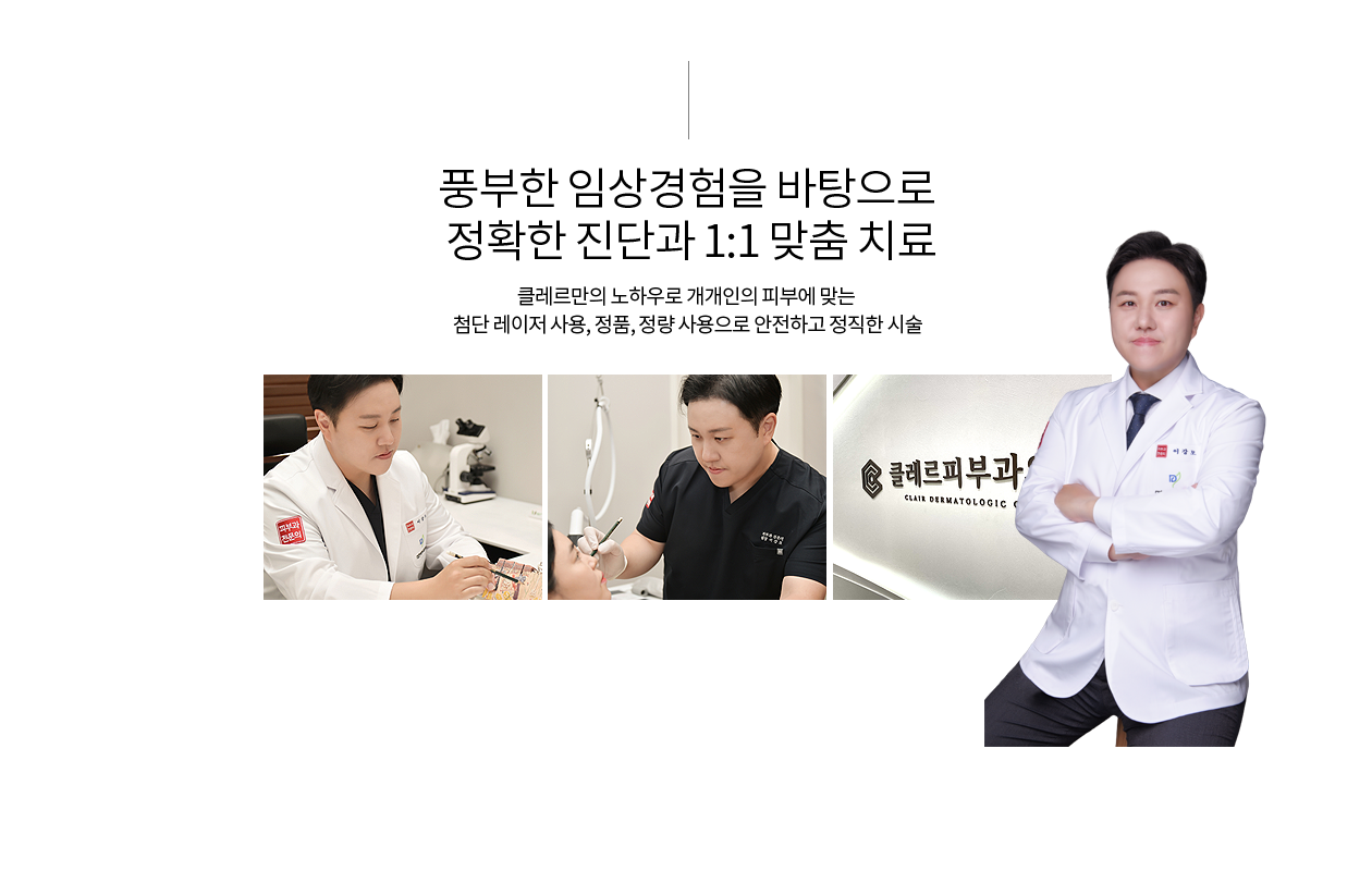 ※ 클레르피부과의 표준비용으로 개인별 피부상태, 시술방법, 이용약물 등을 비롯해 특정 기간별로 시술비용이 달라질 수 있으니, 구체적인 비용은 진료 후 확인이 가능합니다.